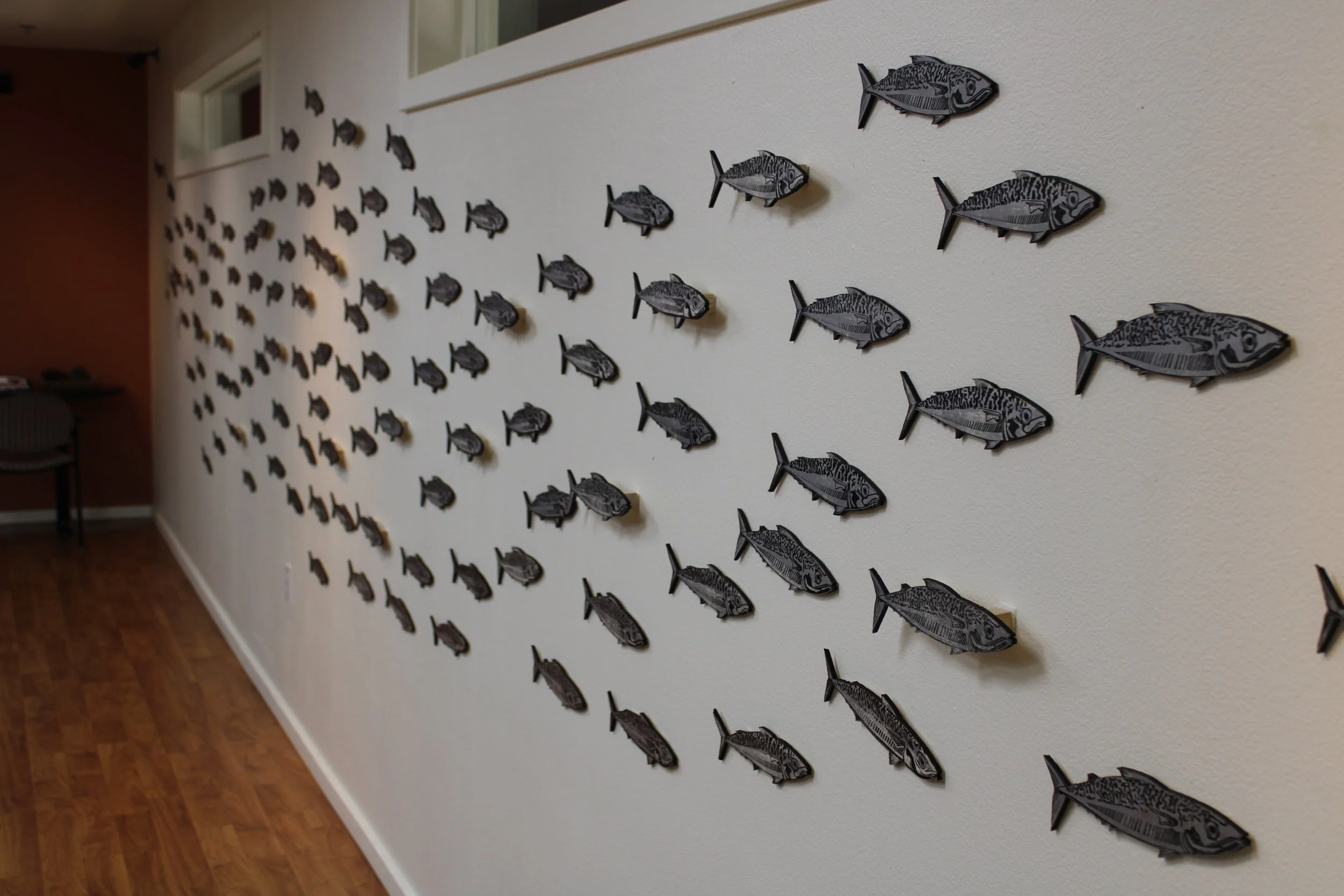 The California Nature Art Museum is excited to host Mackerel School, a dynamic art installation by Angelina LaPointe of Sidecar Press. Every shining fish, depicting California’s native Pacific Mackerel, is a linoleum block print on laser-cut wood.