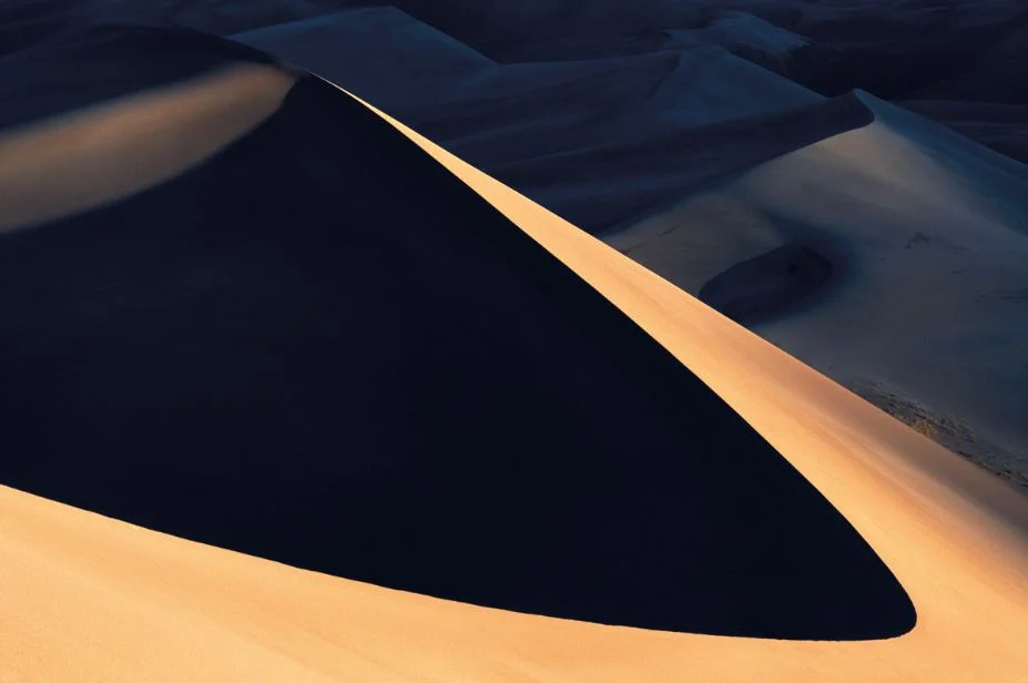 My experiences with Great Sand Dunes National Park essentially started with a frigid November camping trip with a friend. We huddled in sleeping bags on the clean sand of a high dune, but we did not sleep – partially because it was -5˚F, and partially because meteors were streaking the sky all night in twos and threes. I felt peaceful. The next day I walked the winter dunes with my camera, my mind clear and empty. It was as if I had walked into another world. Frost was protected behind each curving ridgeline, reflecting the sky, like pools of deep blue water. My pulse quickened. I had never seen such clean, elegant photographs. Less than a month later, I was back in the dunes again, this time on a four-day trip alone. Again, the images were fresh and amazing. On a still day, I met a pronghorn buck on the dune. Things were making sense.