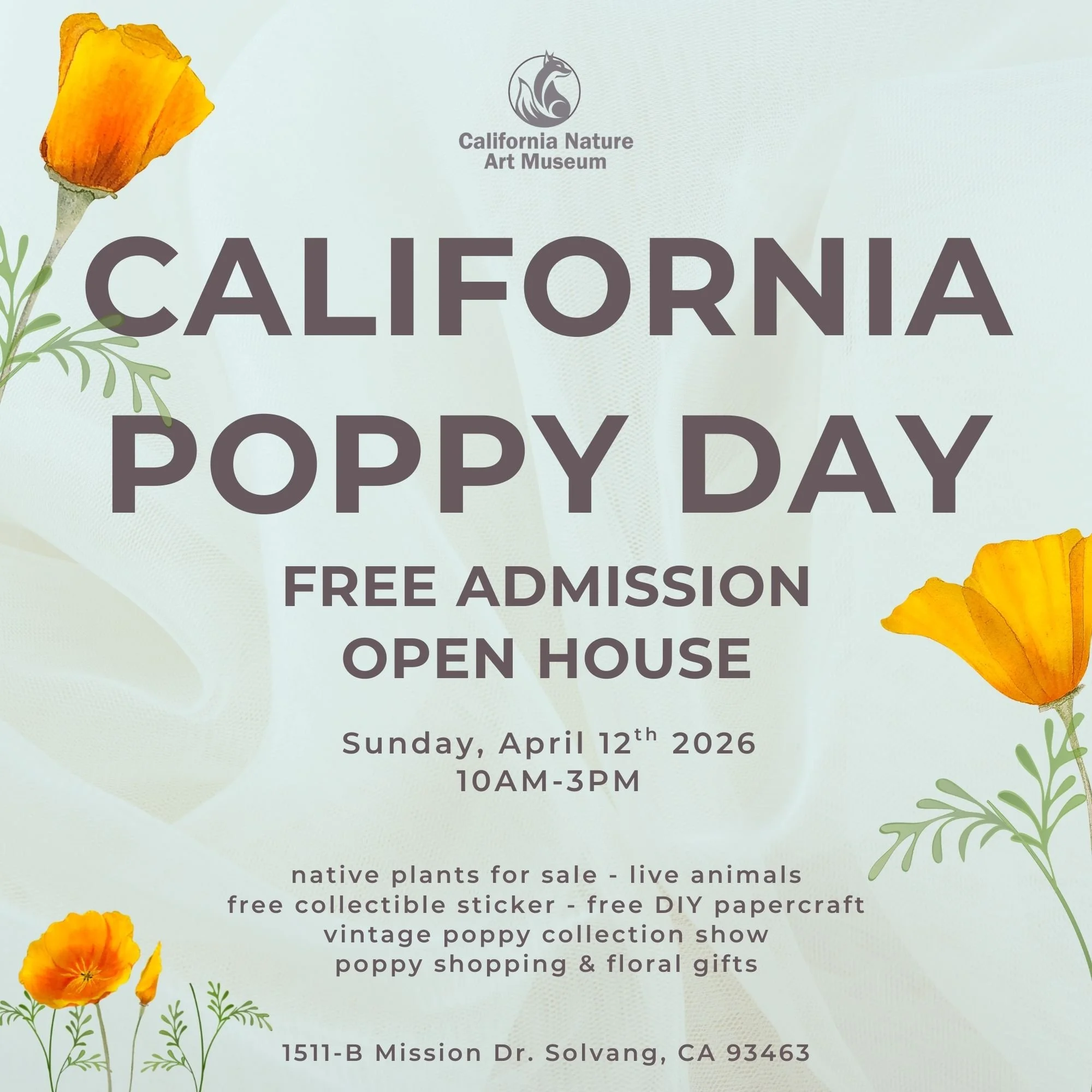 Enjoy free admission at CalNAM for California Poppy Day 2026, held annually in celebration of our state flower and other California native plants. Purchase native plants for your home garden, create your own papercraft flower crown, marvel at CA Poppy vintage items & collectibles, and secure your free 2026 collectible sticker as one of the first 100 guests! This year’s partners include Santa Barbara Hives, Santa Ynez Chumash Environmental Office (SYCECO), Ranch & Poppies, and Collector Leslie Franklin.